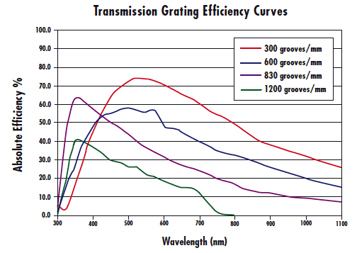 Прозрачные решетки предназначены для рассеивания падающего света под определенными углами. Угловая дисперсия зависит от угла падения и расстояния между канавками. Дисперсия увеличивается по мере увеличения угла падения или уменьшения расстояния между канавками. Крупное расстояние между канавками обеспечивает высокую эффективность, а мелкое расстояние между канавками снижает передачу на длинных волнах, что снижает эффективность.