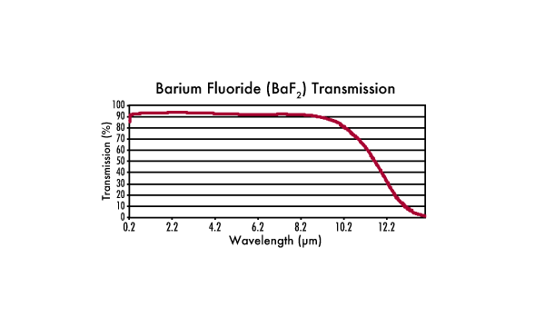 Оптические окна TECHSPEC® из фторида бария (BaF2) могут использоваться в различных приложениях, таких как инфракрасная спектроскопия, благодаря их широкой широкополосному пропусканию, которое простирается от глубокого ультрафиолета до длинноволнового инфракрасного диапазона. Низкий показатель преломления фторида бария 1.48 обеспечивает высокое пропускание без необходимости в просветляющих покрытиях. Оптические окна из фторида бария можно использовать при температуре до +800 °C в сухой среде, но длительное воздействие влаги может ухудшить пропускание в вакуумном ультрафиолетовом диапазоне. В то время как окна из фторида бария менее устойчивы к воде, чем фторид кальция, окна из BaF2 являются наиболее стойкими оптическими фторидами к высокоэнергетическому излучению, но обладают более низким коэффициентом пропускания УФ-излучения. BaF2 имеет твердость 82 по Кнупу.