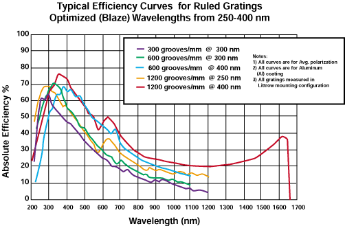 Высококачественные линейчатые решетки инструментального класса удовлетворяют всем требованиям, когда первоочередной задачей является высокая эффективность. Решетки можно выбирать по размеру, расстоянию между канавками и длине волны блеска. Теоретическая разрешающая способность прямо пропорциональна количеству канавок на миллиметр в эталонной решетке. Угол блеска и расстояние между канавками определяют конкретную длину волны и спектральную область, в которой решетка имеет максимальную эффективность.