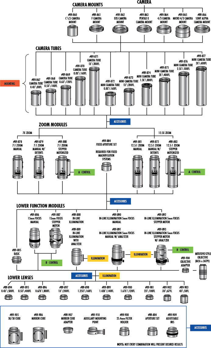 Высокоточные zoom-объективы 7X и 12.5X представляют собой модульные системы объективов, состоящие из крепления камеры, тубуса камеры, основного модуля, нижнего функционального модуля и нижнего объектива. Дополнительная универсальность достигается путем замены модулей для изменения увеличения, поля зрения или оптического пути. 7-кратные и 12.5-кратные высокоточные zoom-объективы совместимы с объективами M26 x 36 TPI Mitutoyo, а также с покрытиями датчиков камер и креплениями от C-Mount до F-Mount и с 35-мм зеркальными камерами. Доступны кубы 50/50 и 90° для поворотов под прямым углом или поддержки нескольких путей визуализации. Также доступен контроллер мотора для многоосевого масштабирования и фокусировки, который можно подключить к портам USB, Ethernet или RS-232/422/285.