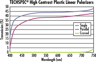 Когда неполяризованный свет попадает в линейный поляризатор, свет, поляризованный перпендикулярно оси поляризации, поглощается, а свет, параллельный оси поляризации, передается. Высококонтрастные пластиковые линейные поляризаторы TECHSPEC® (XP42-200) используют растянутую пленку ПВА для создания оси поляризации. Затем для повышения прочности пленку ламинируют между двумя пластиковыми пластинами.