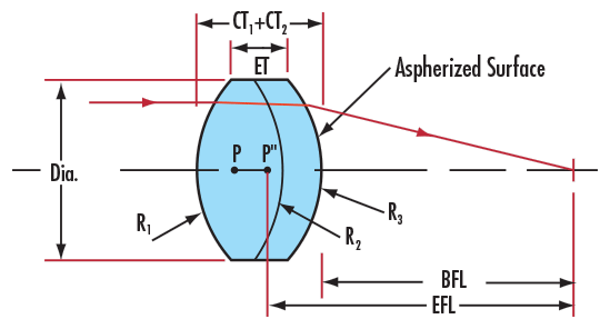 Вторая поверхность дублета сплавлена с литой полимерной асферической поверхностью. Эти формы создают стабильный асферический контур, устраняя или уменьшая ошибки волнового фронта, присутствующие в типичных ахроматах, при одновременном увеличении числовой апертуры. Типичные области применения: фокусировка или коллимация оптоволокна, ретрансляция изображений, проверка, сканирование и получение изображений с высокой числовой апертурой.