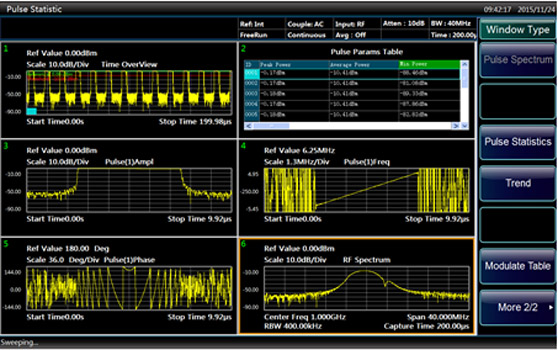 - Измерение спектра импульсного сигнала и характеристик во временной области поддерживает более 20 видов измерения параметров импульса (включая время, амплитуду, частоту и фазу).