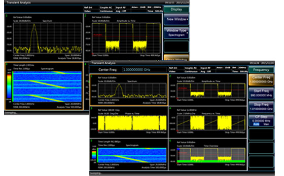 - Одновременно анализировать изменения частоты, амплитуды и фазы анализируемого сигнала с течением времени.
