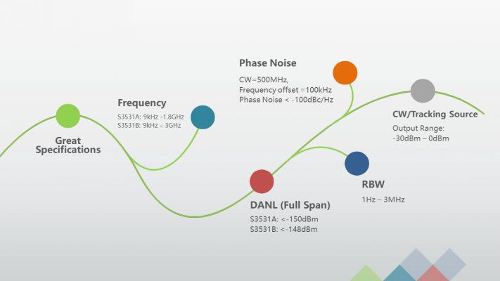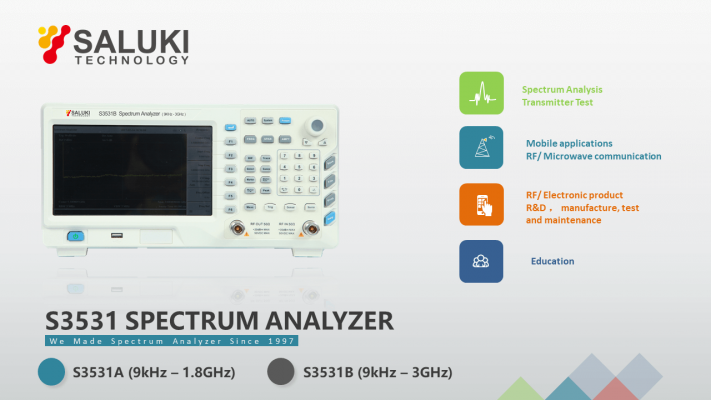 Анализатор радиочастотного спектра серии Saluki S3531 разработан на основе концепции “Меньше, легче, проще”. Серия S3531 занимает небольшое место на рабочем столе и удобна в переноске. Большинство современных радиочастотных приложений находятся в этом диапазоне, например, мобильная связь (GSM, CDMA, LTE, даже низкочастотная 5G), Wi-Fi (2,4 ГГц), дистанционное управление и т.д., Поэтому серия S3531 является хорошим инструментом для тестирования, обслуживания, исследований и разработок этих приложений. Отслеживающий источник и источник постоянного тока обеспечивают возможность проведения сложных измерений. Благодаря такому количеству функций, интегрированных в одну коробку, серия S3531 также очень подходит для обучения.