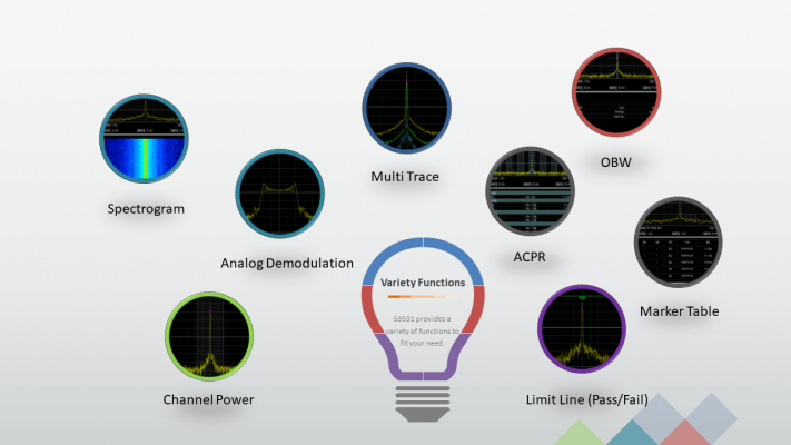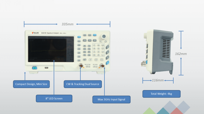 Анализатор спектра серии S3531 оснащен 8-дюймовым ЖК-экраном высокой яркости. Это один модуль мини-размера для настольного прибора.