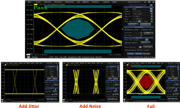 В зависимости от различных стандартов высокоскоростной цифровой связи опции TDR могут использоваться для высокоэффективных тестов на прохождение/провал с использованием предопределенных шаблонов шаблонов глаз. И опция TDR может применять дрожание, шум и другие помехи к моделируемому образцу глаз.