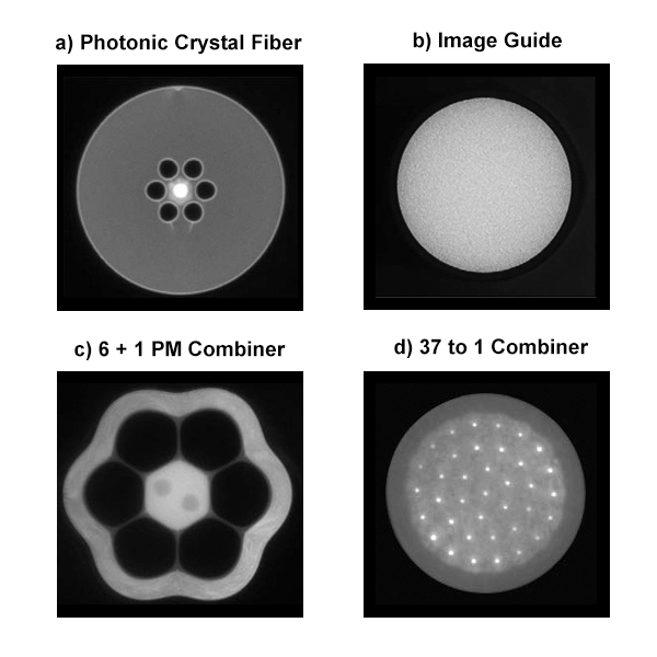 Торцевые изображения волокон с внутренней структурой. а) фотонно-кристаллическое волокно; б) передача изображения; в) волоконный комбайнер 6 + 1 PM; г) волоконный комбайнер 37 в 1
