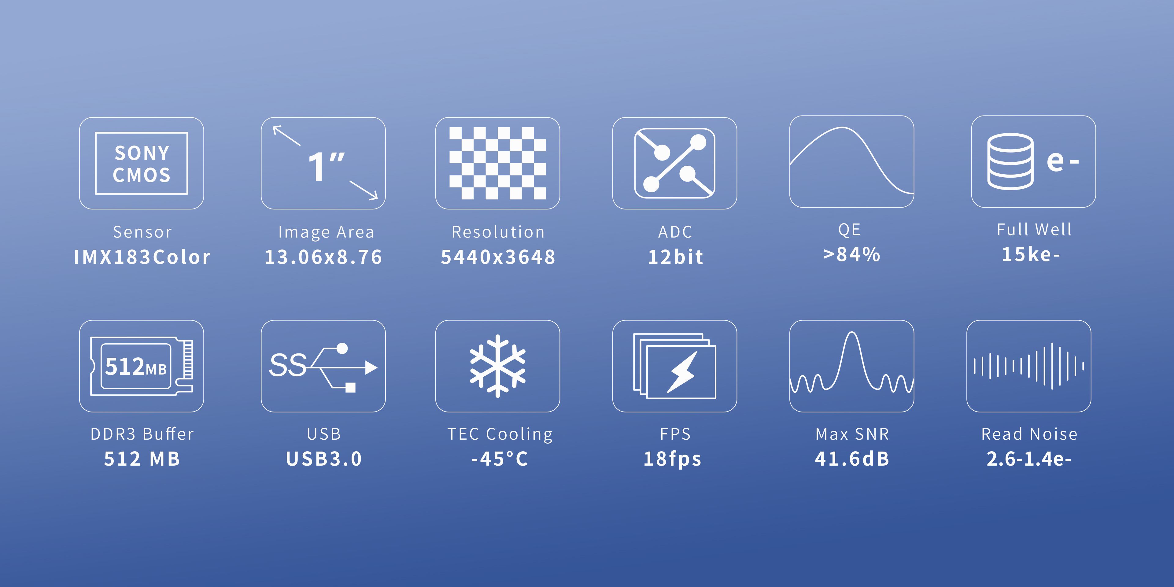 ATR183C имеет разрешение 5440x3648, квадратные пиксели 2,4 мкм, оптический формат 1 дюйм и поддерживает режим биннинга. Камера оснащена двухступенчатой системой охлаждения TEC с превосходным эффектом (отклонение температуры охлаждения можно контролировать в пределах 0,1℃), нагревателем для предотвращения образования конденсата (обогрев окна), встроенным 12-битным АЦП, 15-кетобитным полным накопителем, поддерживает режим высокой частоты кадров (8,6 кадров в секунду при 12 бит / 17 кадров в секунду при 8 бит RAW).