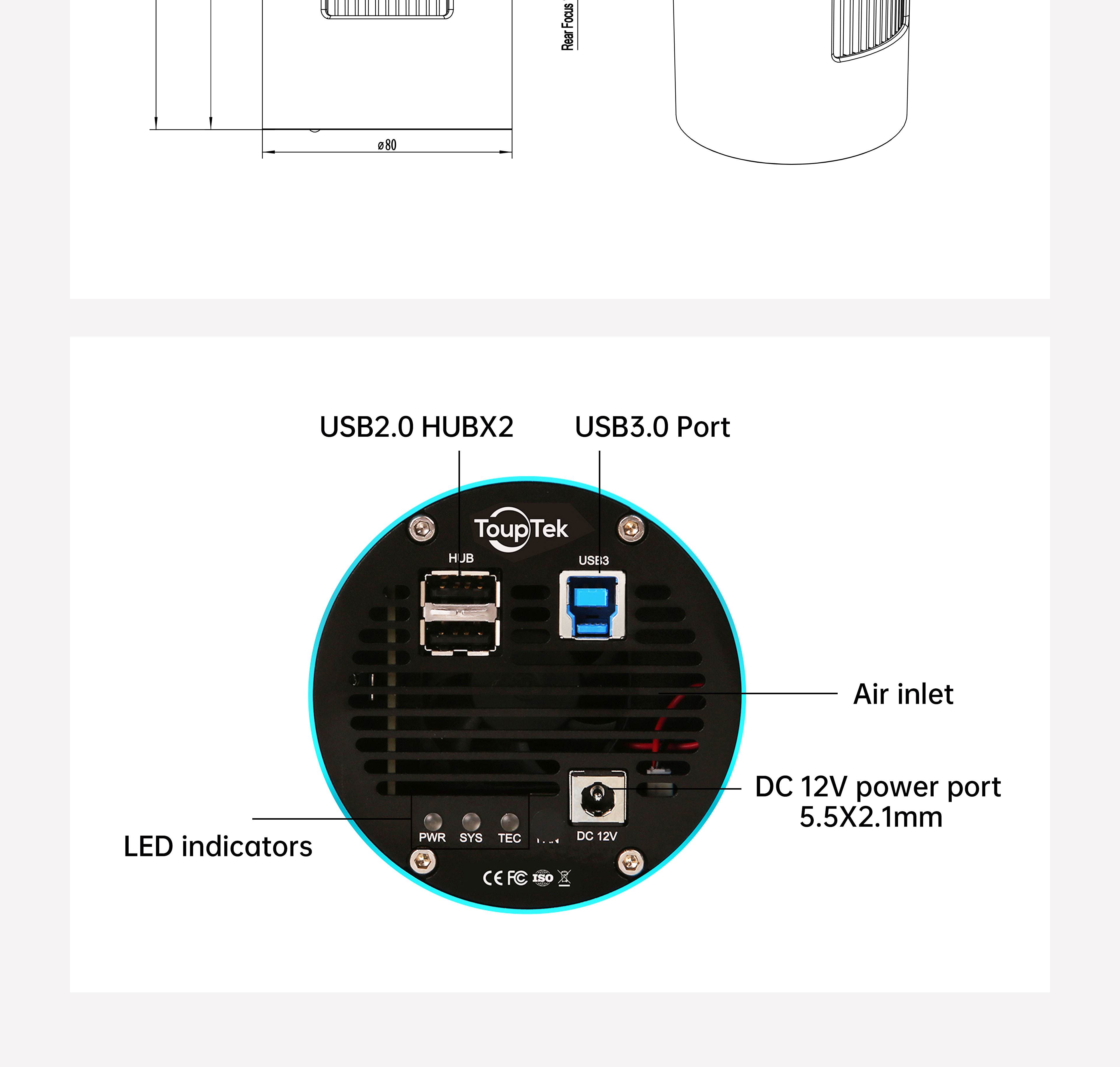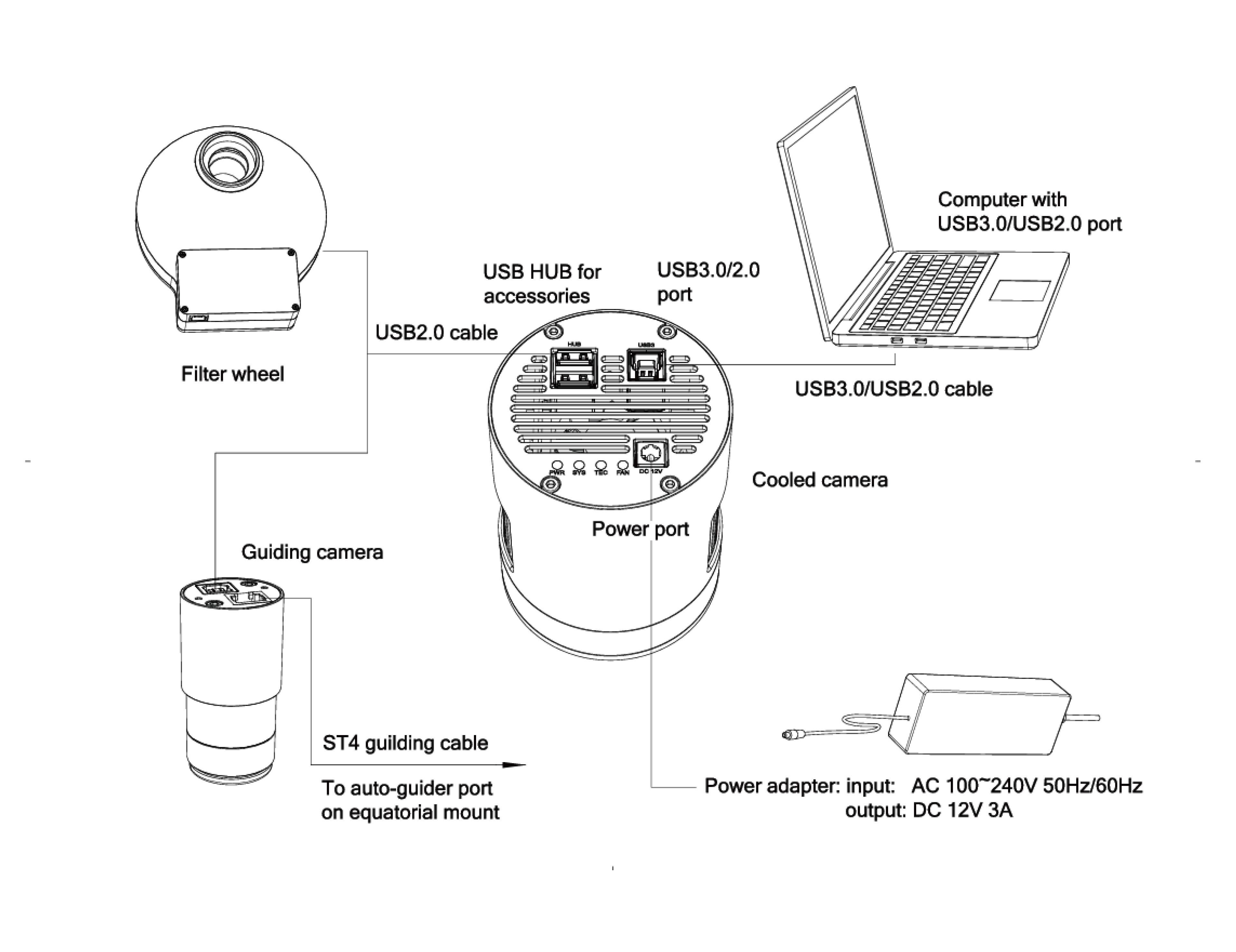 Пожалуйста, помните: все охлаждаемые камеры ToupTek Astro DSO могут питаться только от источника постоянного тока 12 В 3 А. Мы рекомендуем использовать адаптер питания, поставляемый с камерой, или литий-ионный аккумулятор со стабильным выходным напряжением 11-14 В. Пожалуйста, не используйте для питания камеры источники питания с неверными заявленными характеристиками или нестабильным выходным напряжением, так как это может повлиять на качество изображения или даже повредить камеру.