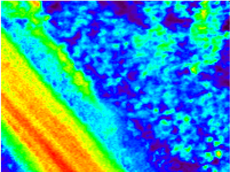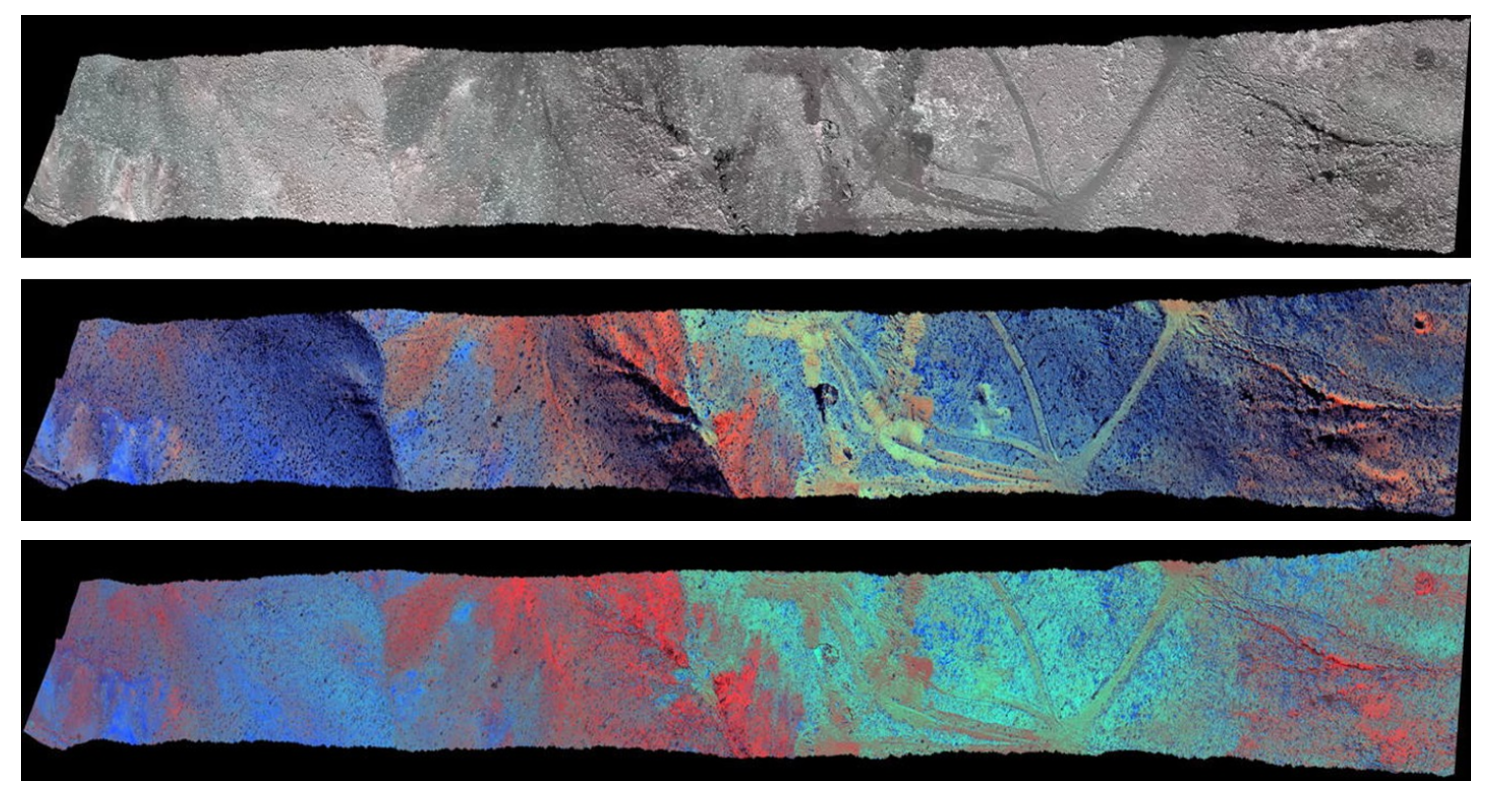 Верхнее изображение: метод спектрального угла по излучению, среднее: по необработанному отражению, нижнее: скорректированный по рельефу и отфильтрованному коэффициенту отражения