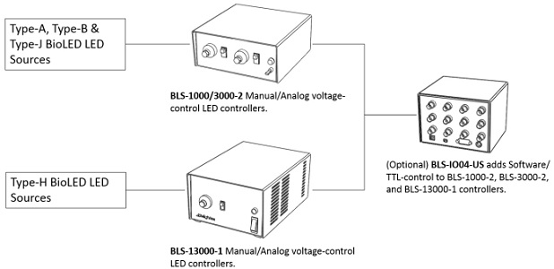 Светодиодные контроллеры Mightex с ручным/аналоговым управлением моделей BLS-1000-2, BLS-3000-2 и BLS-13000-1 могут быть преобразованы в контроллеры с управлением с помощью программного обеспечения/TTL сигнала добавлением дополнительного модуля управления BLS-IO04-US с аналоговыми и цифровыми входы/выходами.