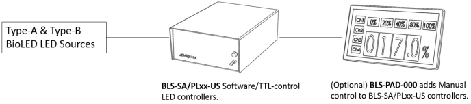 Светодиодные контроллеры с управлением с помощью программного обеспечения/TTL сигнала моделей BLS-SA02-US, BLS-SA04-US, BLS-PL02-US и BLS-PL04-US от Mightex могут быть преобразованы в простой контроллер с ручным управлением с помощью дополнительного модуля управления Mightex с сенсорным экраном BLS-PAD-000.
