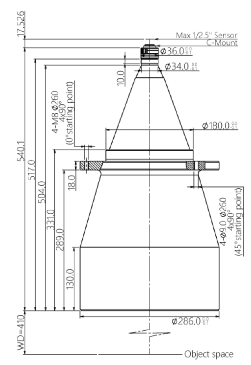 Профессиональная оптика для контроля крупных объектов. Би-телецентрический объектив с увеличением 0.030x и полем зрения Ø240 мм. Оптимизирован для высокоточных измерений геометрических параметров плоских деталей большого формата с использованием камер от 1/2.5" до 1.1". Гарантирует минимальные искажения и высочайшую повторяемость результатов.