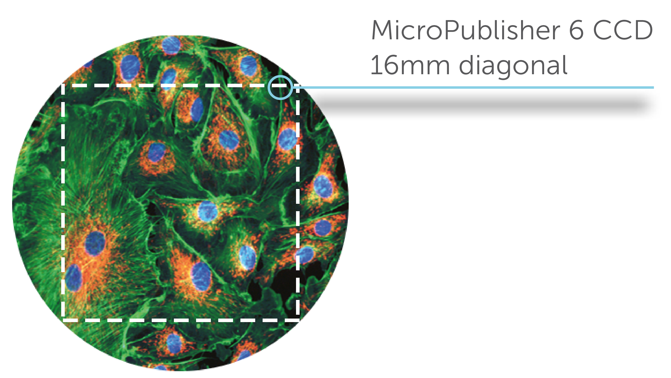 Большое поле зренияНаучные CCD камеры MicroPublisher 6 имеют большое поле зрения с диагональю 16 мм, предназначенное для увеличения пропускной способности и максимального увеличения объема данных, захваченных в одном кадре. Получайте изображения большего размера или увеличивайте пропускную способность, отображая сразу несколько клеток. Увеличенное поле зрения увеличивает видимую площадь образца. |