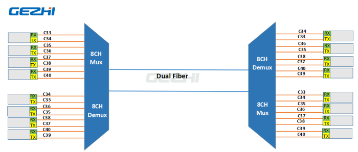 Двухволоконный 8-канальный модуль мультиплексирования и демультиплексирования WDM GEZHI - это пассивный оптический модуль высокой плотности с низкими вносимыми потерями, основанный на технологии тонкопленочного покрытия с длиной волны C33, C34, C35, C36, C37, C38, C39, C40. В комплект поставки входят 8-канальный DWDM mux и 8-канальный DWDM Demux-модуль в сменной кассете LGX с адаптером LC / UPC. 8-канальный плотный модуль мультиплексирования и демультиплексирования WDM идеально подходит для транспортировки волоконно-оптических каналов на большие расстояния по двойному волокну.