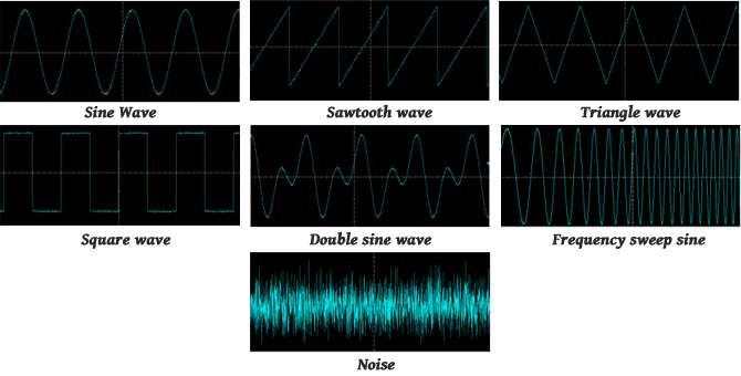 Семь генераторов сигналов включают два стандартных функциональных генератора, один генератор с двойной функцией, один генератор функций сканирования, два генератора шума и один генератор постоянного тока.