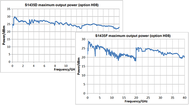 При выборе опции H08 измеренное значение полнодиапазонной выходной мощности генератора сигналов серии S1435A/B/C/D может превышать 20 дБм, а полнодиапазонная выходная мощность генератора сигналов серии S1435F может превышать 17 дБм.
