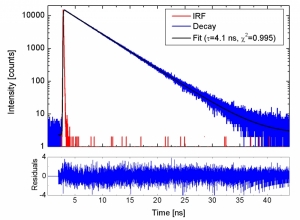 Распад антрацена, измеренный с помощью гибридного фотоумножителя-детектора. На графике показано затухание флуоресценции раствора антрацена в этаноле, полученное с помощью флуоресцентного спектрометра FluoTime 300. Образец возбуждали пикосекундным импульсным диодным лазером с длиной волны 375 нм (LDH-D-C-375) с частотой повторения 10 МГц. Модель с одним экспоненциальным затуханием со временем жизни 4,1 нс очень хорошо соответствует затуханию, что подтверждается взвешенными остатками. Обратите внимание на короткий и чистый отклик детектора, обнаруженный IRF. Анализ, проведенный FluoFit (заменен EasyTau 2).