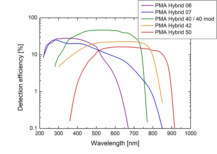 Эффективность обнаружения гибридных фотоумножителей в сборе из серии PMA Hybrid. Для удовлетворения потребностей пользователя в PMA Hybrid могут быть встроены пять различных фотокатодов. PMA Hybrid 06 и 07 чувствительны к ультрафиолетовому излучению и в синей области спектра. Высокая эффективность обнаружения в видимом спектре (до 45% при 500 нм) достигается с помощью PMA Hybrid 40. Для приложений, использующих свет с более длинными волнами видимого спектра и в БИК-диапазоне, PMA Hybrid 42 и 50 являются лучшим выбором.