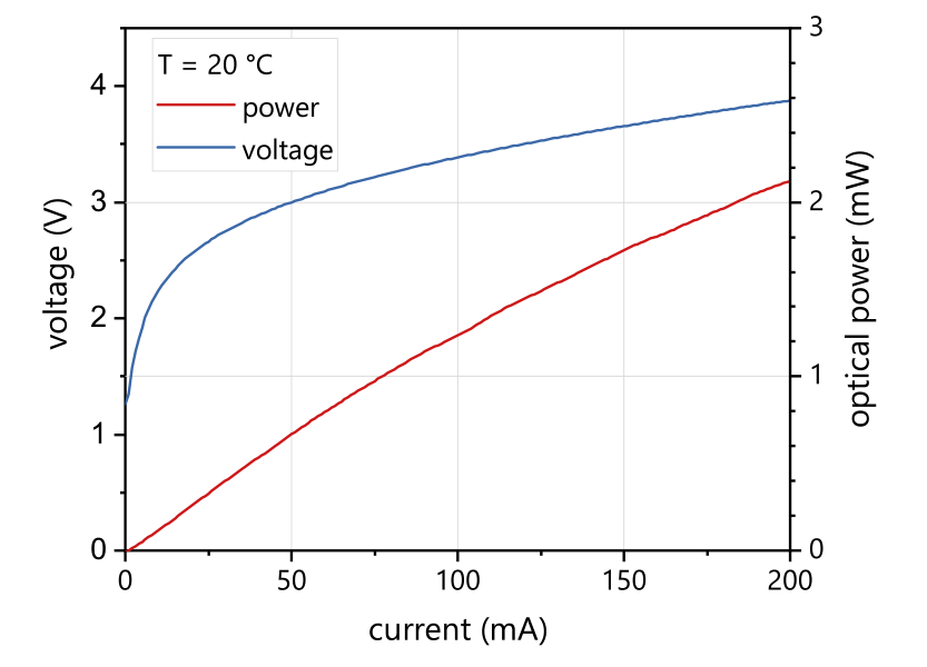 Типичные характеристики мощности, тока и напряжения светодиода среднего инфракрасного диапазона nanoplus 4.3 мкм |
