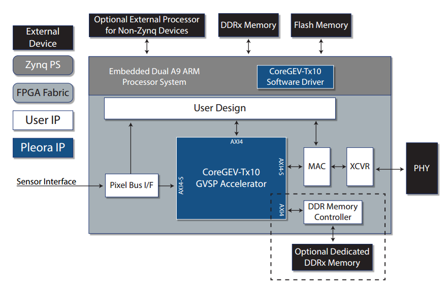 Уникальная гибридная реализация ускорителя ПЛИС Pleora Technologies позволяет пользователям запускать датчик, используя только встроенный процессор и чисто программный подход для быстрого прототипирования. После завершения реализации ПЛИС пользователи переключают программный драйвер в режим «FPGA Acceleration», используя ПЛИС для разгрузки потокового видео и обеспечивая передачу несжатых изображений со скоростью до 10 Гбит / с с малой задержкой. Программный метод также можно использовать для более медленных датчиков в семействе датчиков, что снижает затраты на разработку и обеспечивает согласованный интерфейс для программных приложений во всем семействе или семействах датчиков.