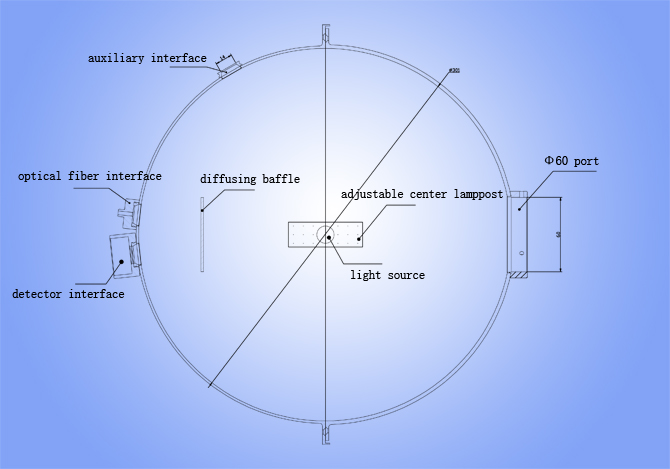 Внутренний диаметр сферы составляет 300 мм. С одной стороны находится порт Ø60 мм, а с другой - два порта Ø14 мм. В эти два порта можно установить оптическое волокно или оптический детектор.