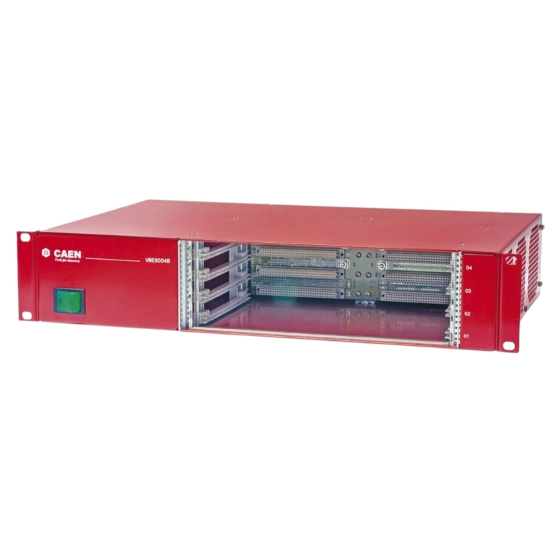 CAEN VME8004B представляет собой 4-слотный VME-кейс, подходящий для плат размером 6U x 160 мм, с объединительной платой, совместимой с VME64. Устройство питается от 100-240 В переменного тока (50-60 Гц). Распределение мощности составляет 25А при + 5 В, 10А при + 12 В, 10А при-12 В VME8004B обеспечивает автоматическую последовательную передачу данных и поддерживает циклы передачи данных CBLT.