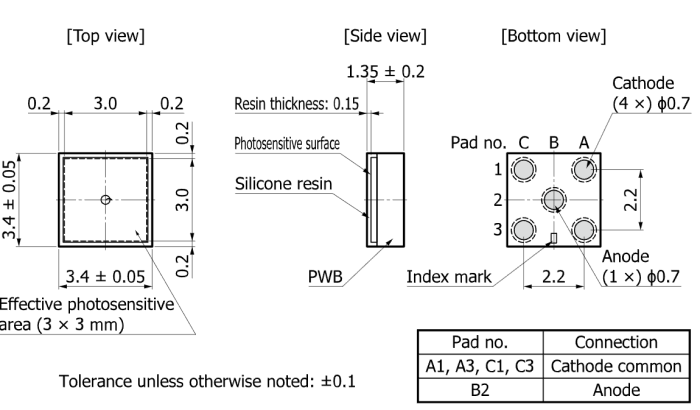 Серия S14160 достигает более высокой эффективности обнаружения фотонов (PDE) и более низкого рабочего напряжения, чем другие MPPC, что позволяет адаптировать их для использования в ПЭТ и радиационных мониторах. Они достигли малого пространства в фоточувствительной области благодаря технологии HWB (hole wire bonding). Зазор от края фоточувствительной области до края корпуса составляет всего 0.2 мм. В этом корпусе реализована четырехсторонняя стыкуемая компоновка.