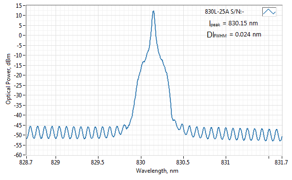 1. Измерено с помощью сканирующего интерферометра Фабри-Перо с разрешением 7.5 МГц и частотой сканирования около 10 Гц. Тестирование интерферометра не проводится для каждого производимого лазера, вместо этого стандартным тестом является измерение OSA с разрешением 10-20 мкм;