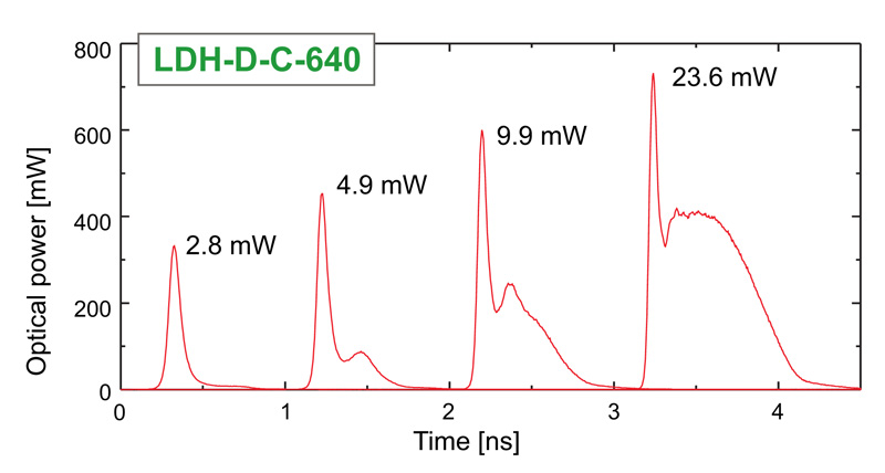 Изменяя общее количество носителей (т. е. управляющий ток) в диоде, можно изменять выходную мощность диода. Однако более высокая мощность импульса, т.е. больший инжектируемый ток, приводит к дополнительным колебаниям внутри лазерного диода. Эти колебания можно рассматривать как пример профилей импульсов LDH-P-C-640B при различных пиках или плечах выходной мощности во временном профиле импульса. Как следствие, повышенная выходная мощность диода всегда приводит к увеличению ширины импульса и неоднородной временной форме импульса. «Чистые» и почти симметричные импульсы могут быть достигнуты только вблизи порога генерации.