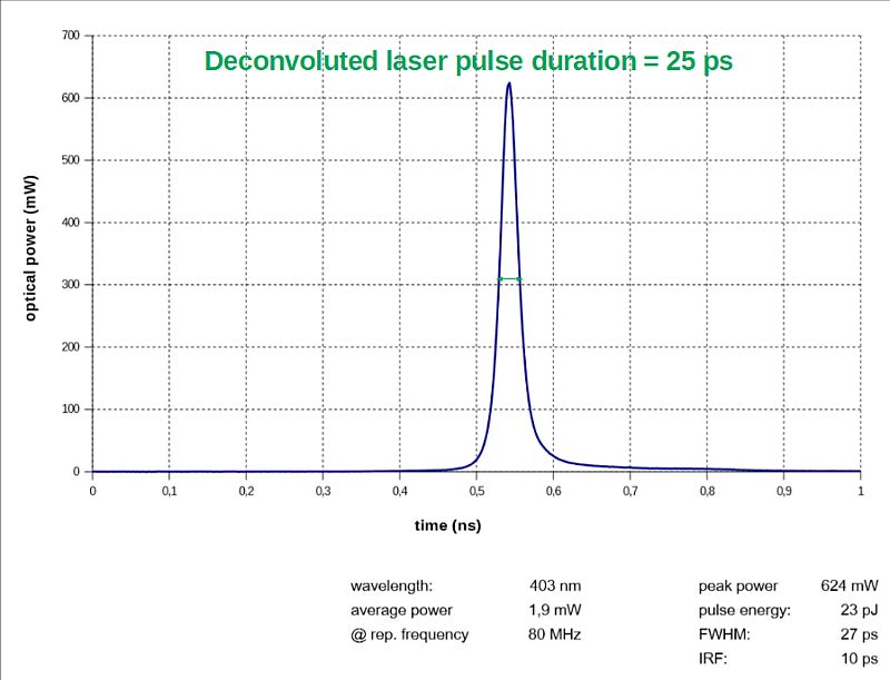 Все лазерные головки излучают пикосекундные импульсы шириной на полувысоте (FWHM), как правило, около 90 пс или ниже. Для некоторых лазерных головок возможны даже длительности импульса ниже 20 пс. Сама ширина импульса не может контролироваться напрямую, но зависит от выбранного уровня мощности диода. При максимальной интенсивности ширина импульса может увеличиваться.