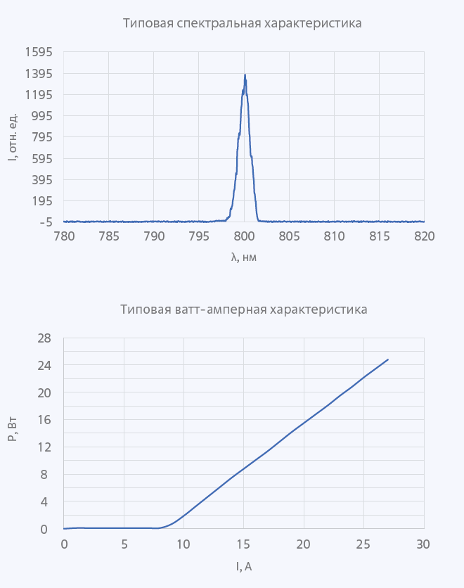 Применения:- Эффективная оптическая накачка твердотельных лазеров; - Лазерные системы для технологических применений; - ИК лазерные осветители с высокой оптической выходной мощностью; - Лазерные медицинские терапевтические приборы и приборы фотодинамической терапии. |