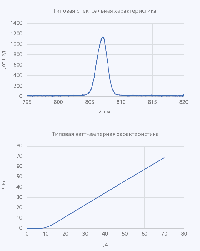 * Контроль основных параметров осуществляется на теплоотводе (тип 012) с температурой 25°C, при номинальной средней мощности импульса лазерного излучения, длительности импульса 250 мкс и частоте 25 Гц.