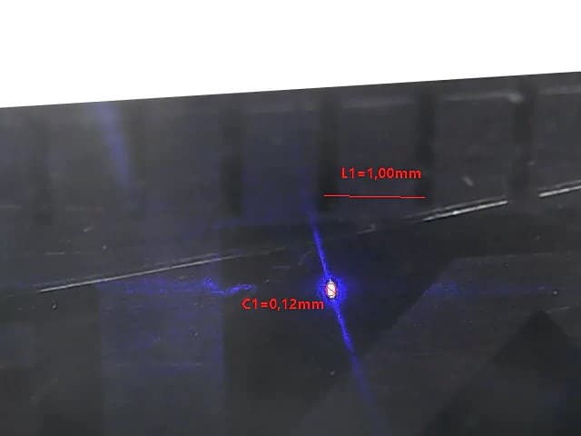 * Лазерное пятно первого лазерного диода 180 x 17 мкм (глубина фокуса 2 мм). 160-170 кВт/см3. Лазерное пятно второго лазерного диода: 21 x 350 мкм (глубина фокуса 3.75 мм) 100-100 кВт/см3.