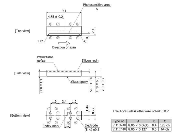 S11106-10 - это КМОП линейные датчики изображения с полимерным уплотнением, которые обеспечивают скорость передачи видеоданных 10 МГц и низкое потребление тока.