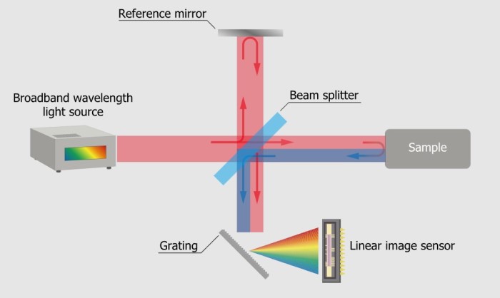 На образец направляется свет от источника света с широкополосной длиной волны, интерференционный свет спектрально рассеивается, затем детектируется линейным датчиком изображения. Изображение в направлении глубины образца получается путем преобразования Фурье полученной информации о длине волны.