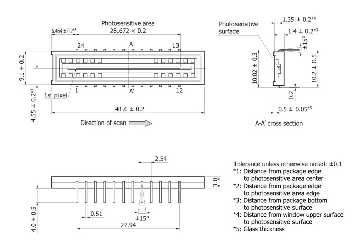 S11639-01 - это высокочувствительный CMOS-линейный датчик изображения, использующий светочувствительную область с вытянутыми по вертикали пикселями (14 × 200 мкм). Другие характеристики включают высокую чувствительность и высокое сопротивление в УФ-области. S11639-01 работает от одного источника питания напряжением 5 В, что делает его пригодным для использования в недорогих спектрометрах.