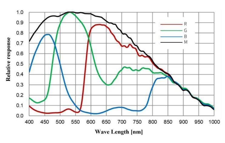 График показывает относительную чувствительность матрицы к различным длинам волн света.
