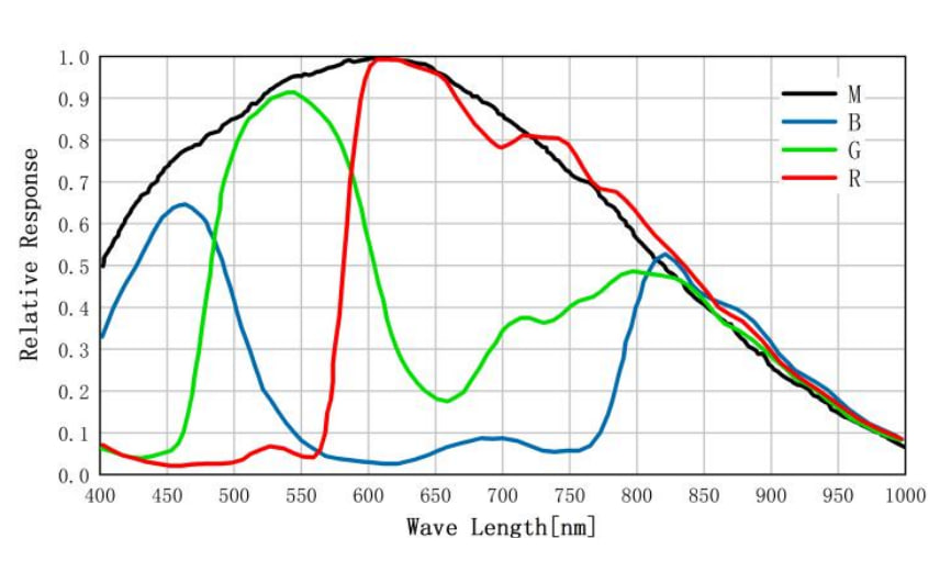 График показывает относительную чувствительность матрицы к различным длинам волн света.