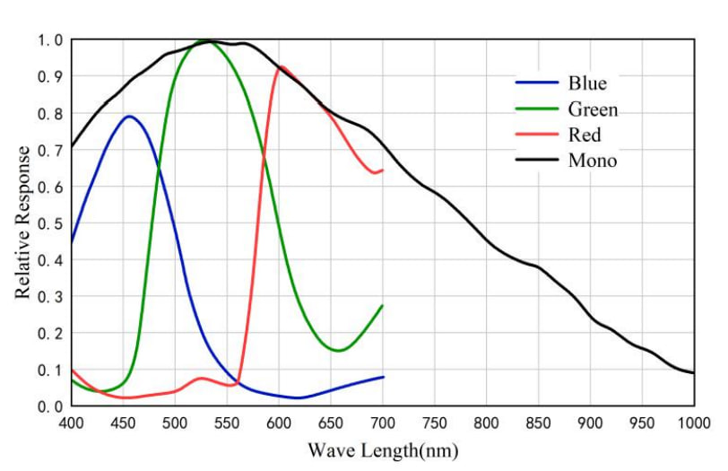 График показывает относительную чувствительность матрицы к различным длинам волн света.