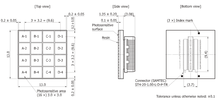 Серия S13361 представляет собой массив MPPC (SiPM) для прецизионных измерений. Он унаследовал превосходные характеристики своего предшественника с низким уровнем послеимпульсных помех, а также обеспечивает более низкий уровень перекрестных помех и меньший темновой счет. В этом MPPC массиве используются сквозные кремниевые каналы (TSV) для минимизации нечувствительных участков вокруг фоточувствительной области. Четырехсторонняя стыкуемая структура позволяет размещать несколько элементов в двухмерном массиве с небольшими интервалами.