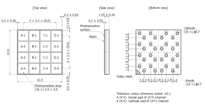Серия S13361 представляет собой массив MPPC (SiPM) для прецизионных измерений. Он унаследовал превосходные характеристики своего предшественника с низким уровнем послеимпульсных помех, а также обеспечивает более низкий уровень перекрестных помех и меньший темновой счет. В этом MPPC массиве используются сквозные кремниевые каналы (TSV) для минимизации нечувствительных участков вокруг фоточувствительной области. Четырехсторонняя стыкуемая структура позволяет размещать несколько элементов в двухмерном массиве с небольшими интервалами.