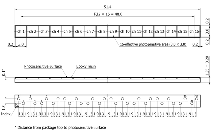 S13363-3050NE-16 – это миниатюрный одномерный массив MPPC на 16 каналов, выполненный по технологиям TSV (through-silicon via) и CSP (chip size package). Эффективная площадь фоточувствительной поверхности каждого канала составляет 3 x 3 мм. Зазор между каналами сужен, а мертвая зона уменьшена. Это подходит для таких приложений, как ядерная медицина, неразрушающий контроль и эксперименты в области физики высоких энергий, где требуется измерение с помощью счета фотонов.