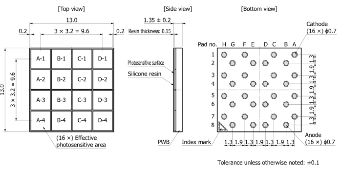 Серия S14161 достигает более высокой эффективности обнаружения фотонов (PDE) и более низкого рабочего напряжения, чем другие MPPC, что позволяет адаптировать их для использования в ПЭТ и радиационных мониторах. Они достигли малого пространства в фоточувствительной области благодаря технологии HWB (hole wire bonding). Зазор от края фоточувствительной области до края корпуса составляет всего 0.2 мм. В этом корпусе реализована четырехсторонняя стыкуемая компоновка.