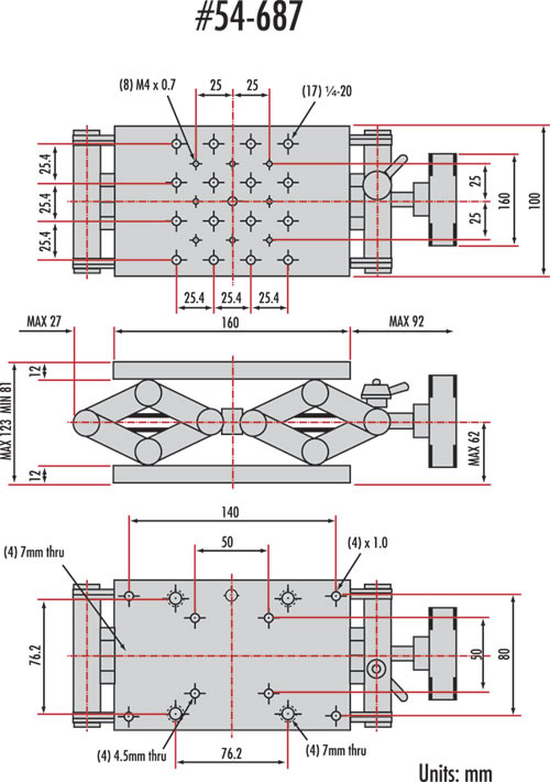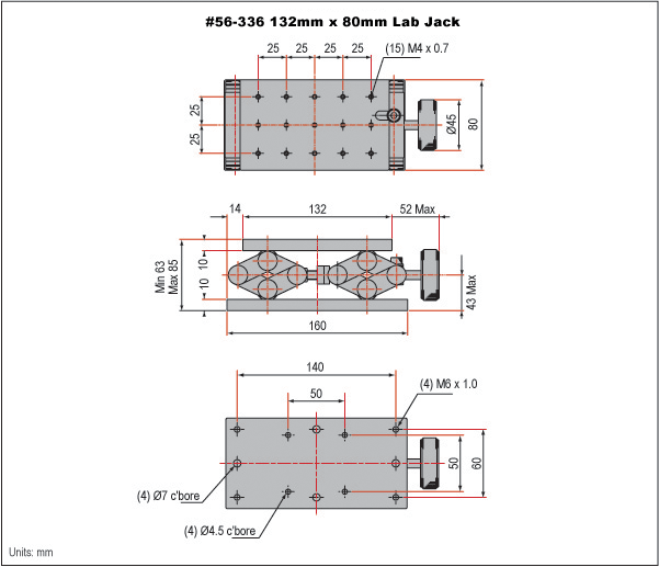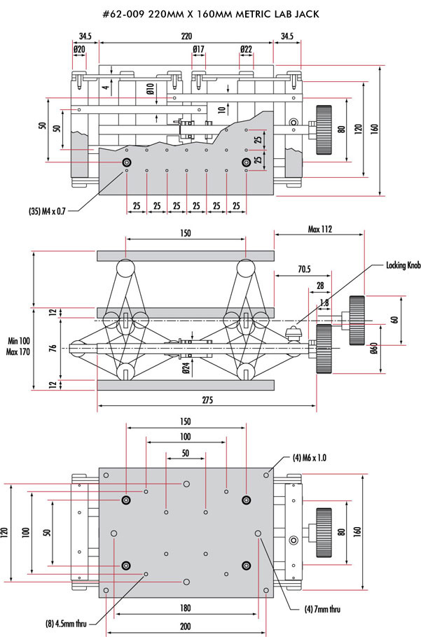 Разъемы Metric Labs отличаются прочной конструкцией и точным винтовым ходом, позволяющим точно регулировать вертикальное положение большинства оптических компонентов или оборудования, с максимальным весом до 55 фунтов. Верхние поверхности представляют собой прецизионно обработанные монтажные платформы с резьбовыми отверстиями ¼-20 и M4 (см. схему). Нижние платформы имеют несколько дополнительных метрических M6 и ¼-20 английских отверстий с зазором, расстояние между которыми позволяет адаптировать их к обычным монтажным поверхностям. В метрических лабораторных домкратах используется фиксирующая ручка для фиксации вертикального положения на желаемой высоте. Каждый полный оборот ручки регулировки перемещает платформу по вертикали на 1 мм.