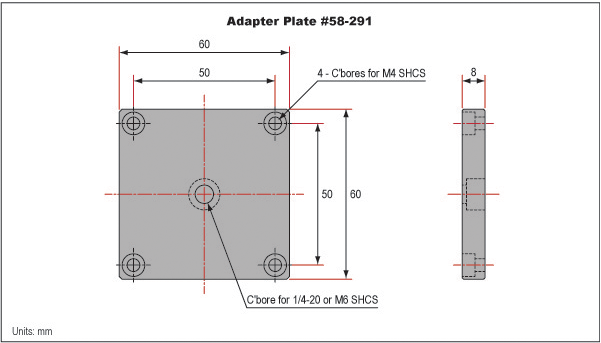 Квадратная пластина № 58-290 для крепления к квадрату 40 мм толщиной 8 мм крепится к отверстиям M3 и имеет цековку для винтов с головкой под торцевой ключ ¼–20 или M6. Совместим со следующими этапами: № 55-029, № 55-030, № 55-031, № 55-838 и № 55-839.