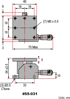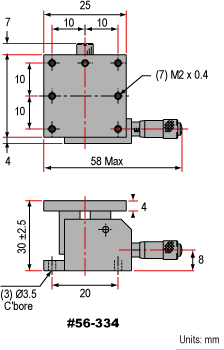 Прецизионный столик вертикального перемещения обеспечивает микрометрическое перемещение оптических компонентов. Один оборот ручки равен 0,5 мм. Регулировка высоты составляет ±2,5 мм для столиков 25 и 40 мм и ±5,0 мм для столиков 60 и 80 мм.