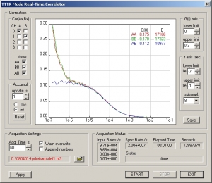 HydraHarp 400 - снимок экрана коррелятора FCS, входящего в комплект программного обеспечения. HydraHarp 400 предлагает 65536 ячеек гистограммы на входной канал и позволяет собирать более 4 миллиардов отсчетов (32 бита) на ячейку. Каждый входной канал даже имеет внутреннюю регулируемую задержку в диапазоне ± 100 нс при разрешении 1 пс. Эта уникальная функция устраняет необходимость в специально подобранных длинах кабелей или задержках кабелей для различных экспериментальных установок.