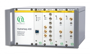 HydraHarp 400 - Многоканальный модуль TCSPC (небольшой вариант с 4 каналами) HydraHarp 400 доступен в различных размерах, которые позволяют устанавливать до 4 или до 8 идентичных синхронизированных, но независимых входных каналов. Они могут использоваться как входы детектора для экспериментов по корреляции совпадений или как независимые входы остановки для TCSPC. Для TCSPC с быстродействующими источниками возбуждения предусмотрен специальный общий вход синхронизации. Это позволяет выполнять прямой запуск-остановку при полной частоте повторения лазеров с блокировкой режима со стабильной частотой повторения до 150 МГц. Эксперименты с низкой частотой повторения выигрывают благодаря возможности HydraHarp выполнять несколько остановок.